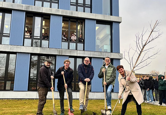 Drei Ahornbäume verschönern jetzt das neue Außengelände am Neubau des Gymnasiums Wilhelmsdorf. Die Bäume waren ein Geschenk des Architektenbüro Schaudt und Partner aus Konstanz, das den Neubau geplant und den Bau geleitet und begleitet hatte.