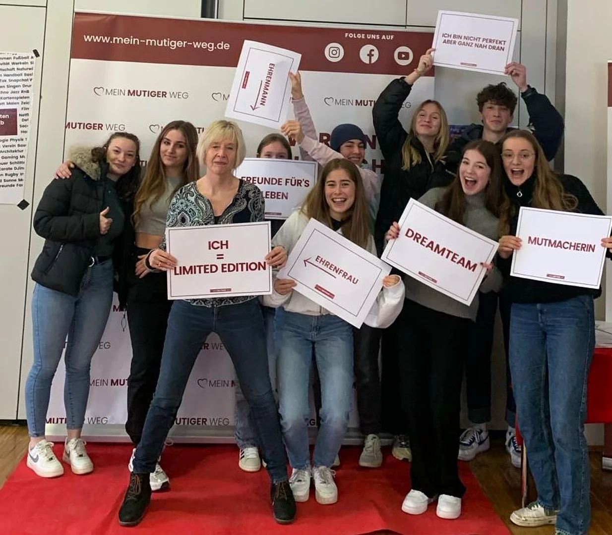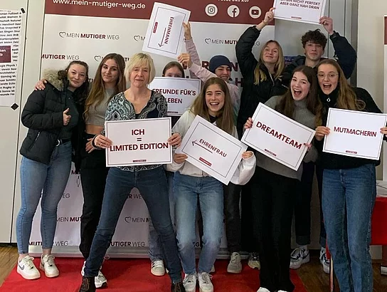 Die Schülerinnen und Schüler erarbeiteten fünf Schritte für ihren eigenen mutigen Weg. Sie wagten einen Blick auf ihre Stärken und formulierten eigene Entscheidungskriterien für die Berufswahl, lernten wie sie ihr Selbstvertrauen stärken und mit Ängsten umgehen können. Dabei zeigte das junge "Mutmacher-Team" besonders durch die eigenen Lebensbiographien, dass der Weg zum Traumjob nicht immer gerade ist. So schildert auch das Gründer-Brüderpaar Pascal und Frederic Keller ihren Weg zur eigenen Firma als "Achterbahn der Gefühle".