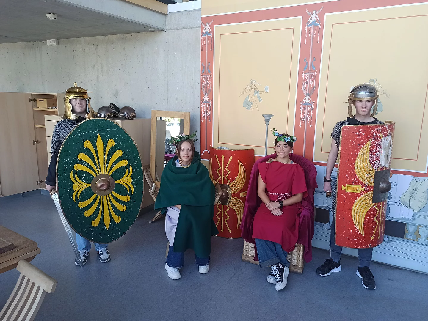 Einen praktischen Einblick in die Lebenswelt der Römer, von denen ihre Schulbücher handeln, erhielten die Lateinschüler in Workshops. Hier konnte auf Papyrus geschrieben oder eine Münze aus Gips hergestellt werden. Beim Ausprobieren römischer Kleidung schlüpften die Schüler wortwörtlich in die Rolle der Römer vor über 2000 Jahren.