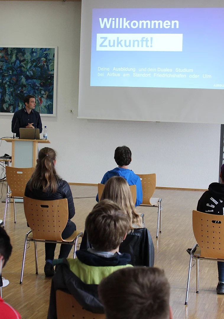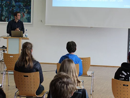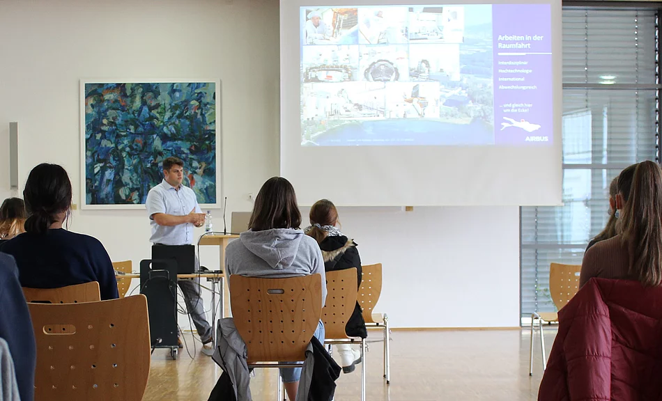 Die vielen verschiedenen Phasen bis zur Fertigstellung eröffnen aber auch ganz unterschiedliche Tätigkeitsfelder und Arbeitsbereiche, in die Schülerinnen und Schüler während der Veranstaltung Einblicke erhalten konnten. Bei diesen theoretischen Einblicken soll es jedoch nicht bleiben. Patrick Hartung, Ausbildungsbeauftragter von Airbus, ermutigte die Schüler*innen, sich bei Interesse frühzeitig auf einen Praktikumsplatz zu bewerben: „Wichtig sind nicht in erster Linie die Noten, sondern die Neugierde, die man der Sache entgegenbringt.“ Vielleicht ist ja der/die ein oder andere tatsächlich neugierig geworden und will einen weiteren Schritt in Richtung Weltraum wagen. Dieser ist in Immenstaad am Bodensee gar nicht so weit entfernt, wie man denkt. Das Bogy-Praktikum beispielsweise, das im Mai für die 10. Klassen auf dem Programm steht, wäre für ein erstes Kennenlernen eine gute Gelegenheit.