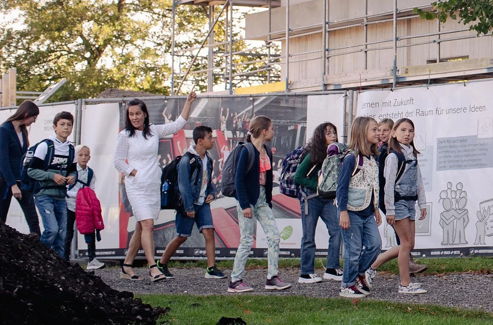 „Es ist unser klares Ziel, auch bei unserem neuen Konzept ∑igma+, jeden einzelnen Schüler, jede einzelne Schülerin so gut wie möglich auf ihre individuelle Zukunft vorzubereiten.“, erklärt Schulleiter Michael Dörmann. „Und es ist toll zu sehen, dass wir in Wilhelmsdorf mit dieser Einstellung nicht alleine sind. Die am Schulleben beteiligten und die Gemeinde – allen voran Bürgermeisterin Sandra Flucht – sind sich der Wichtigkeit von Investitionen in die Bildung der Kinder und Jugendlichen bei der Umsetzung des Neubaus bewusst.“, lobt Michael Dörmann die gute Zusammenarbeit. Stellt das Bauprojekt mit seiner Investitionssumme von über 10 Millionen Euro doch eine besondere Herausforderung vor allen Dingen für eine Gemeinde von der Größe Wilhelmsdorfs dar. Das zeitgemäße Miteinander am Gymnasium Wilhelmsdorf lebt von der Einbindung der Schüler*innen. So erfolgt auch gleich bei der Begrüßung durch Schulleiter Michael Dörmann die Einladung an die neuen Fünftklässler*innen: „Wir freuen uns auf euren neuen Blick und sind gespannt auf eure neuen Ideen. Macht mit, beteiligt euch und helft uns, die Schule noch besser zu machen.“