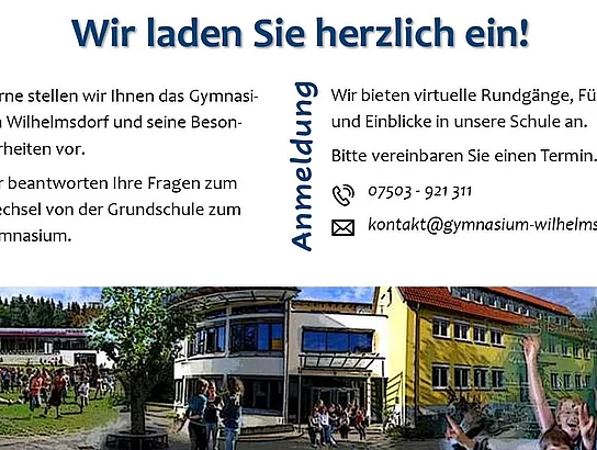 Natürlich finden sich auch auf unserer Homepage viele Informationen zu unserem Schulkonzept, dem Freien Kursangebot und weiteren Besonderheiten unserer Schule. Derzeit erstellen wir eine eigene Rubrik "Das sind wir - Schulvorstellung digital", auf der Broschüren und Infomaterial zusammengetragen werden. Anfang Februar wird dort ein neues Video erscheinen: Schülerreporter aus der 5. Klasse haben das Gymnasium Wilhelmsdorf erkundet und beantworten die Fragen zum Schulwechsel auf das Gymnasium Wilhelmsdorf aus ihrer Sicht. Schauen Sie rein!
