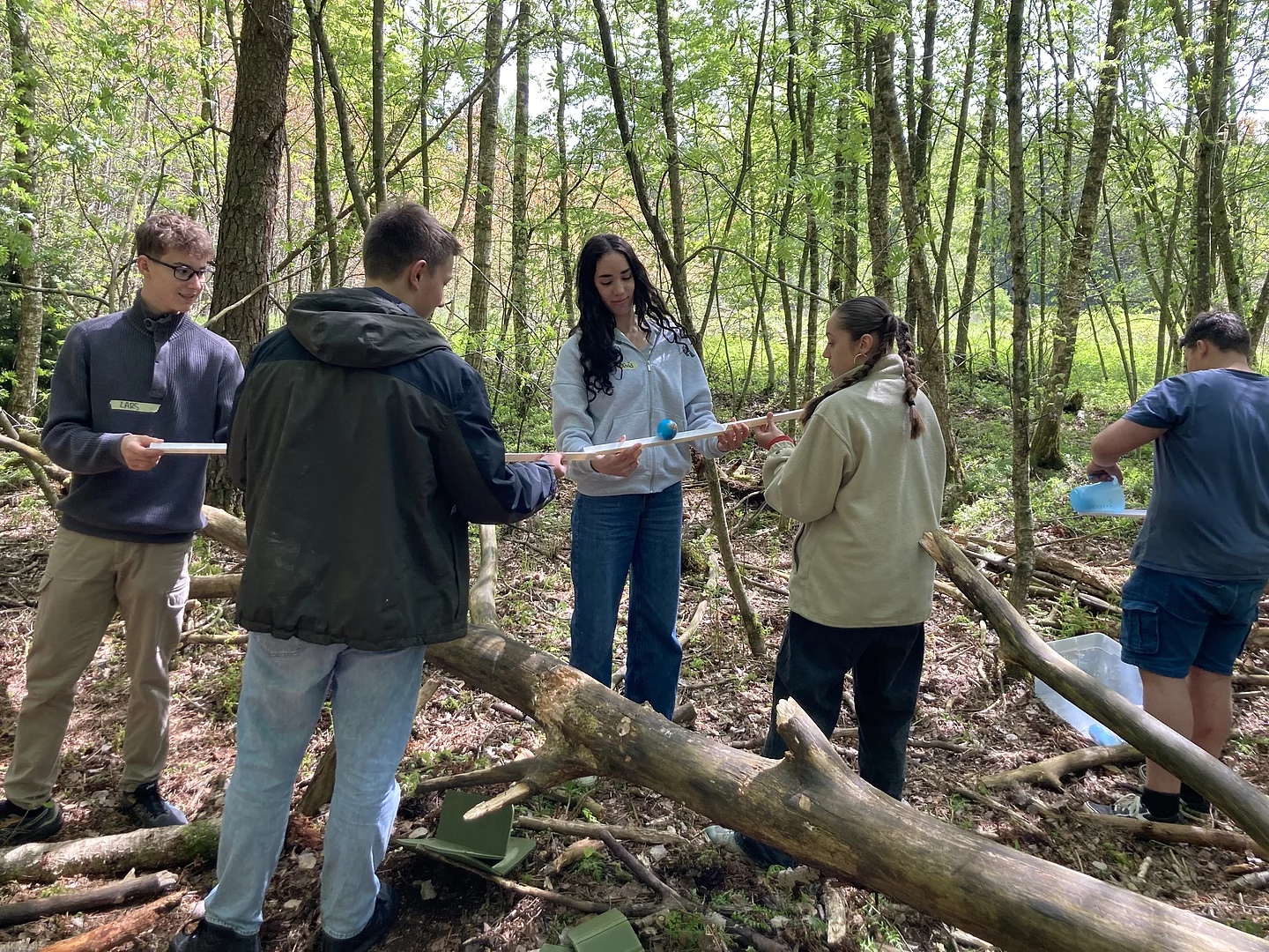 Für das Kennenlernen der nahegelegenen Natur engagierte Biologielehrerin Janina Haag das "Waldmobil". Waldpädagoge Silvan Hild kam der Anfrage gerne nach und verbrachte mit der Klasse 8a zwei Schultage im Riedwald. Durch Sinneserfahrungen, Kooperationsspiele, Gruppenarbeiten und regem Wissensaustausch bekamen die Schülerinnen und Schüler schnell ein Gefühl dafür, wie nützlich der Wald für ein Leben auf der Erde ist. Geforscht wurde dafür an unterschiedlichen Stationen zum Thema Wald und Wasser. Dabei wurden chemische und biologische Gewässeruntersuchungen vorgenommen, Wasserfilter hergestellt und "Wälder im Glas" erschaffen.