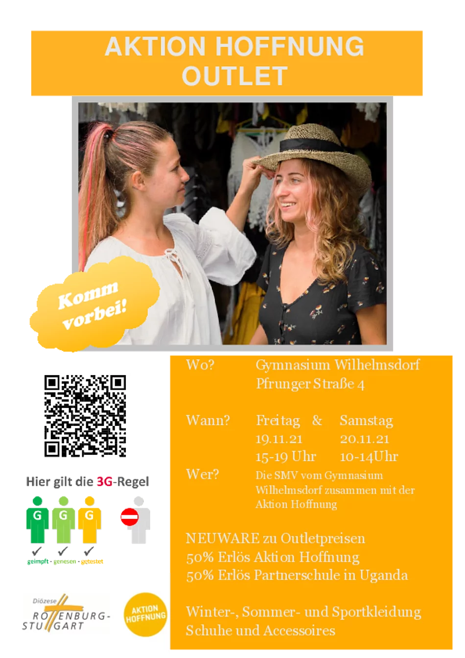 Die SMV des Gymnasiums Wilhelmsdorf veranstaltet am 19. und 20. November 2021 ein Kleideroutlet im Bürgersaal der Gemeinde Wilhelmsdorf. Die Schülerinnen und Schüler unterstützen damit die Partnerschule des Gymnasiums in Uganda.