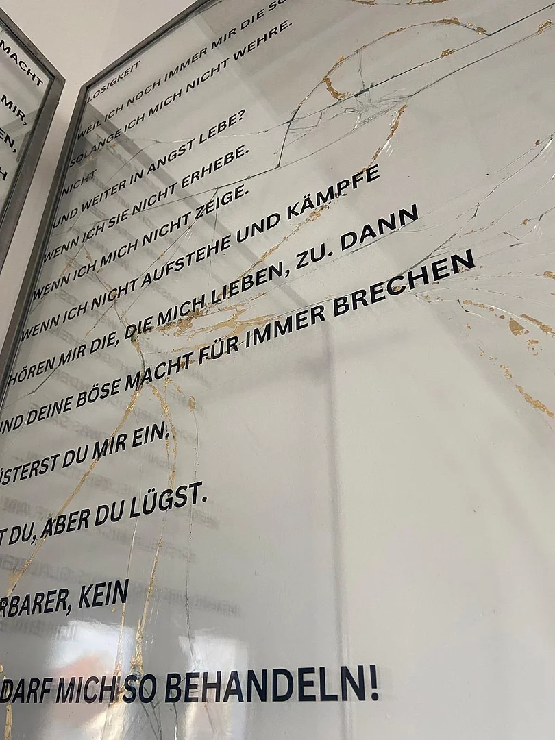 Inspiriert von dem Gedicht hatte im letzten Jahr die damalige Abiturientin Sophia Krug unter der Leitung von ihrer Kunstlehrerin Barbara Seitz mit viel Engagement bei sich zuhause in ein Kunstwerk aus zerbrochenem Glas entworfen. Dieses kann nun in der Sitzecke des ersten Stocks im Neubau des Gymnasiums bewundert werden. Sophias Intention war es, mit dem Bruch des Glases „ein Ausbrechen eines Opfers aus seinem Martyrium“ symbolisch darzustellen. Gleichzeitig sollten die Brüche und Scherben aber auch für die Narben einer betroffenen Person stehen, die, wie die von Blattgold durchzogenen Glasadern auf der zweiten Seite des Gedichts, „zwar sichtbar sind, aber auch heilen können“, so Sophia. Im Schulgebäude soll das Gedicht auf dieses „schwierige, aber dennoch sehr wichtige Thema, vor dem wir alle nicht die Augen verschließen können hinweisen“, meint Michael Dörmann.