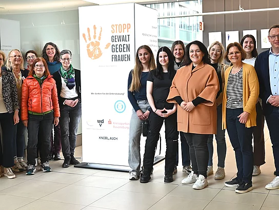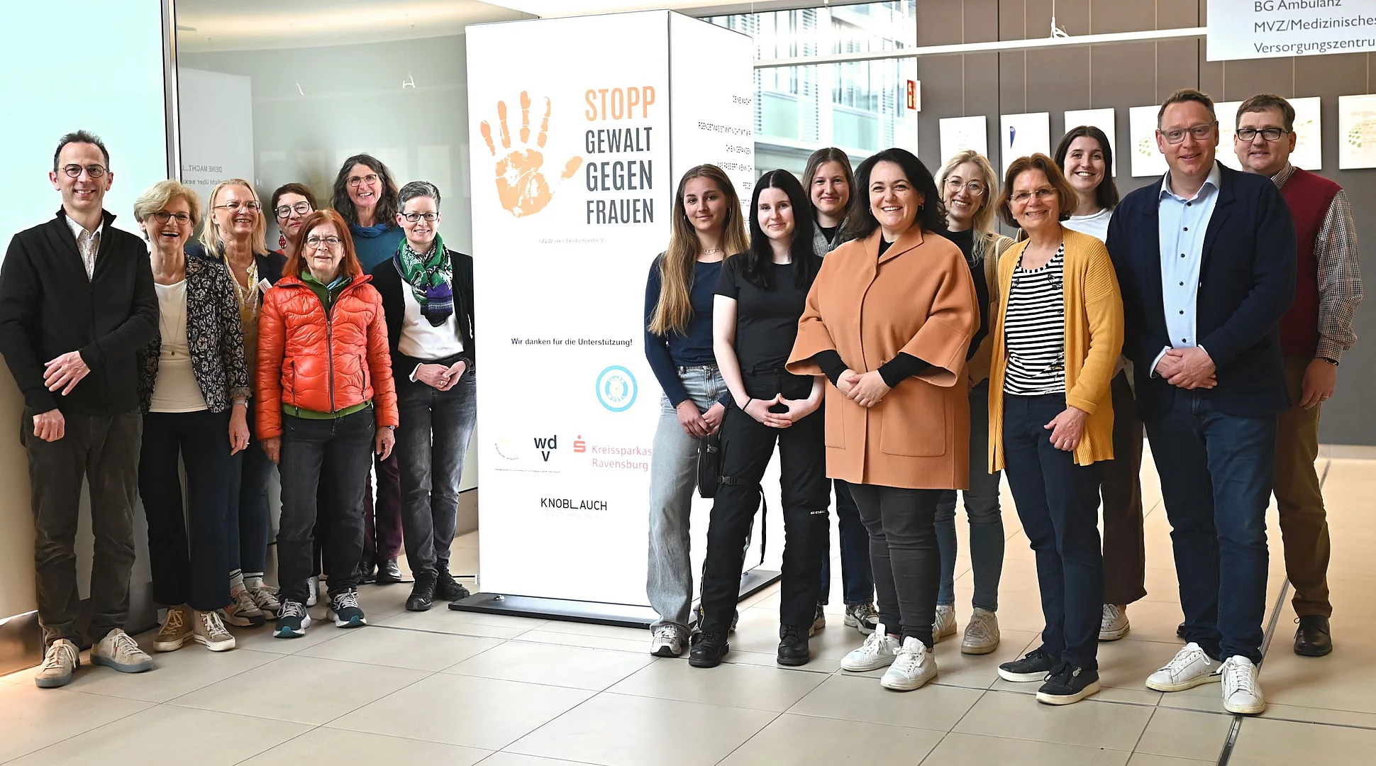 In der darauffolgenden Woche wurde das Gedicht auf einer beleuchteten Wandersäule in der Oberschwabenklinik Ravensburg präsentiert. Die im November 2024 angefertigte Säule wird von den Ravensburger Beratungsstellen Frauen und Kinder in Not e.V. und Brennessel e.V. für die Öffentlichkeitsarbeit im Kampf gegen sexualisierte und häusliche Gewalt verwendet. Die Leiterin von Brennessel, Cora Bures, welche schon mehrfach am Gymnasium Wilhelmsdorf im Rahmen der Präventionsarbeit tätig war, betonte, dass es vor allem bei sexuellem Missbrauch im Jugendalter, wie im Gedicht dargestellt, „um Machtdemonstration und -ausübung“ ginge. Begleitet wurde die Ausstellungseröffnung u.a. vom Geschäftsführer der OSK, Franz Huber, Vertreterinnen der Marketingabteilung der OSK, der Gleichstellungsbeauftragten der Stadt Ravensburg, Eva Komprecht, Vertreterinnen der Sponsoren von der Stiftung Ravensburger und Inner Wheel sowie den vier Verfasserinnen. An dem neuen Ausstellungsort, an welchem die Säule nun für unbestimmte Zeit stehen soll, sollen Patientinnen und Patienten sowie insbesondere die „80 Prozent weiblichen Mitarbeiterinnen der Oberschwabenklinik angesprochen werden“, meint Huber. Alle Beteiligten freuen sich ausgesprochen über das Zustandekommen dieser Kooperation.