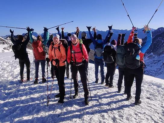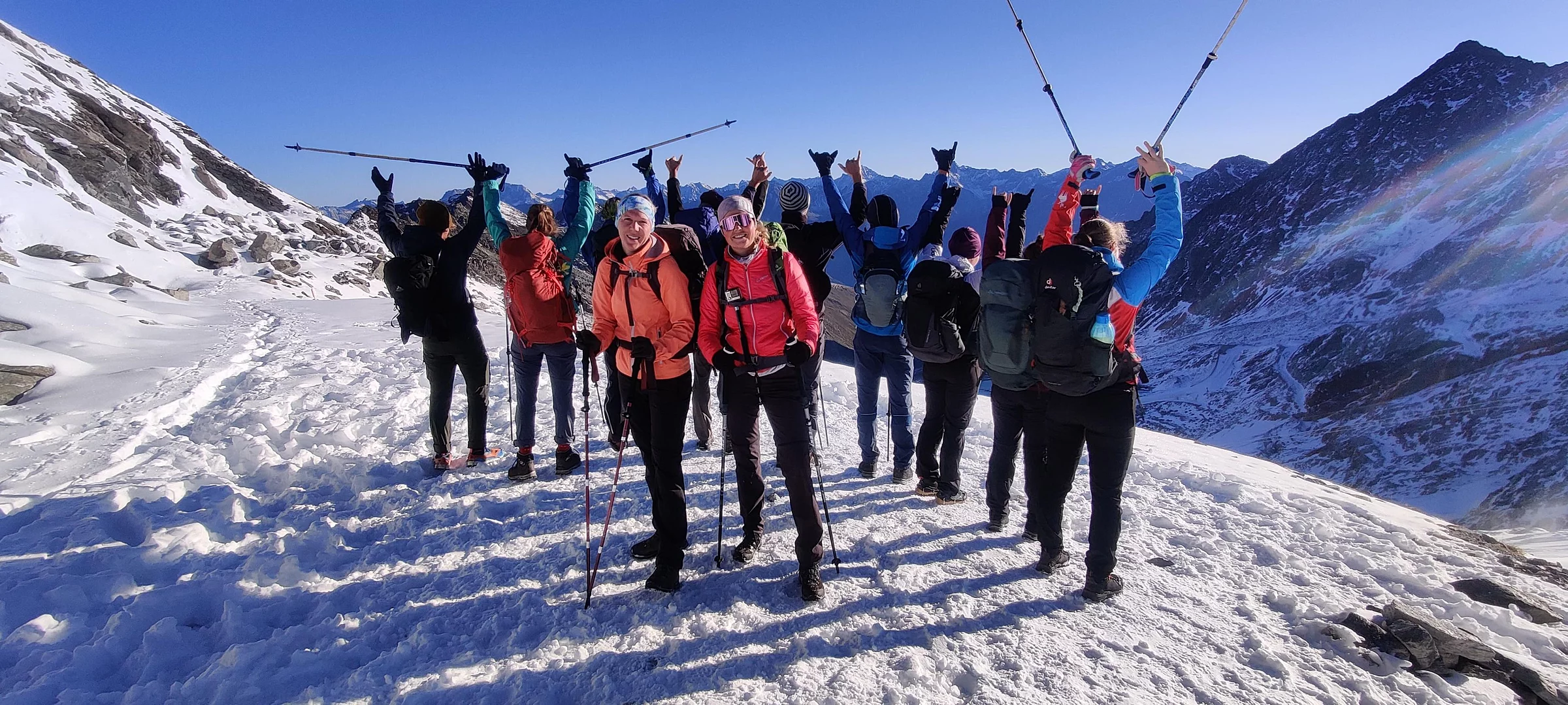 Die Exkursionsgruppe der Alpenüberquerung legte die Bergetappen zu Fuß von Oberstdorf bis nach Meran zurück. Dabei stand die persönliche Herausforderung - mental und körperlich - im Vordergrund. Denn der Weg führte nicht nur durch Sonnenschein, sondern auch durch anspruchsvolle Passagen mit viel Schnee.