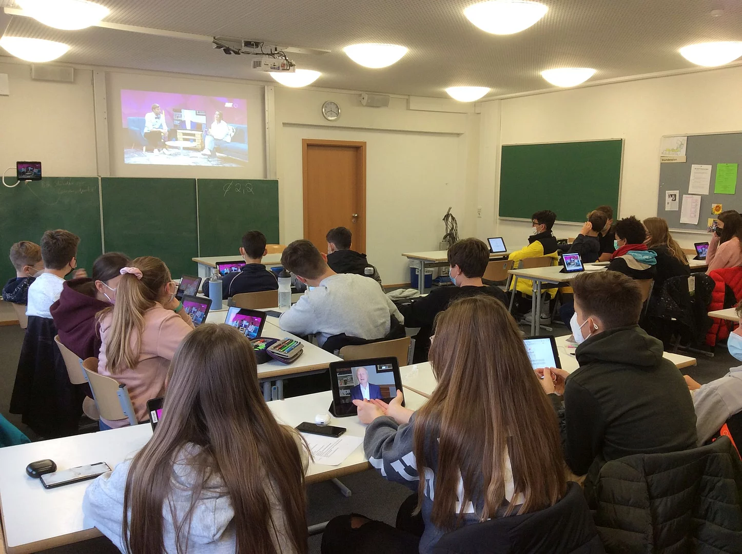 Die Klasse 8a nimmt am diesjährigen ARD – Jugendmedientag teil und sammelt dabei Erfahrungen in der modernen Medienlandschaft. Ausgestattet mit Ipads, Smartphones und Beamer hieß es den ganzen Vormittag lang: „Medienkompetenz statt Mathe“. Die SuS erlebten ein spannendes live-Programm aus Workshops zu aktuellen Themen der digitalen Medienwelt sowie umfassende Einblicke in die Arbeit des (Auslands-)Journalismus