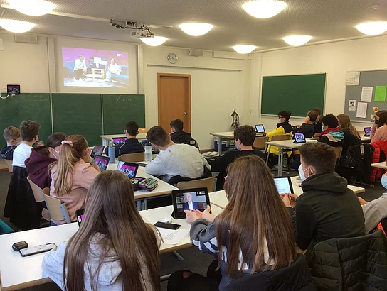 Mithilfe ihrer Smartphones waren die Achtklässler mittendrin: Über die App “Mentimeter“ beantworteten die SuS unmittelbar die Multiple-Choice-Fragen der Redaktion, so dass die Antworten in der live-Sendung erschienen und diskutiert werden konnten. Im Anschluss gewährte Moderatorin Isabel Schayani den SuS einen Einblick hinter die Kulissen des seit 1963 ausgestrahlten ARD-Weltspiegels („Behind the scenes: Weltspsiegel!“). Live aus Moskau zugeschaltet war Demian von Osten, der von seiner nicht immer ganz ungefährlichen Arbeit als Auslandskorrespondent berichtete.