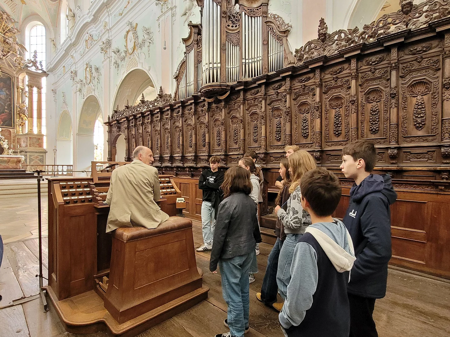 Eine beeindruckende Begegnung hatten die Schülerinnen und Schüler unseres Gymnasiums auch mit dem Organisten der Ochsenhausener Basilika, Thomas Fischer. Seine speziell für unsere Gruppe organisierte Vorführung einer der bedeutendsten historischen Orgeln Süddeutschlands ließ sie „hinter die Kulissen“ dieses monumentalen Instruments blicken, offenbarte sein komplexes Innenleben und faszinierte sie mit kraftvollem Klangfarbenreichtum.