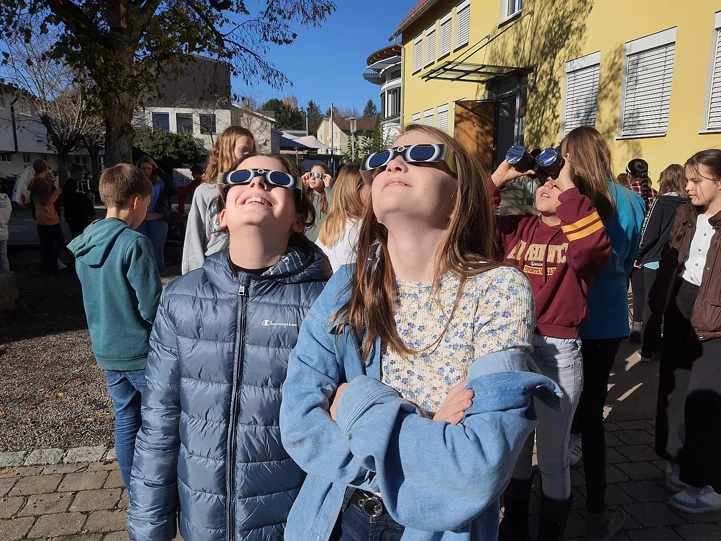 Angeleitet durch Sandra Pautsch, Physiklehrerin am Gymnasium Wilhelmsdorf, unterbrachen viele Schülerinnen und Schüler und auch ihre Lehrer den Schultag für einen Blick an den Himmel. "Zum Glück hat das Wetter mitgespielt.", freut sich Sandra Pautsch. "Es ist toll, wie die Astronomie für einen kurzen Moment ganz im Mittelpunkt steht und uns das große Ganze vor Augen führt." Mit Spezialbrillen, Teleskopen und folierten Ferngläsern konnte verfolgt werden, wie der Mond sich vor die Sonne schiebt und einen Teil der Strahlung abdeckt. Nur circa 20 Prozent der Sonne waren in unserer Gegend bedeckt und doch deutlich spürbar. "Das muss sehr seltsam sein, wenn der Mond die Sonne ganz bedeckt", findet eine Fünftklässlerin. "Irgendwie unheimlich.", ergänzt ihre Freundin. Die nächste totale Sonnenfinsternis wird in Deutschland jedoch erst wieder 2081 zu beobachten sein. "Wer weiß, wo wir da sind...", sagen die beiden und lachen.