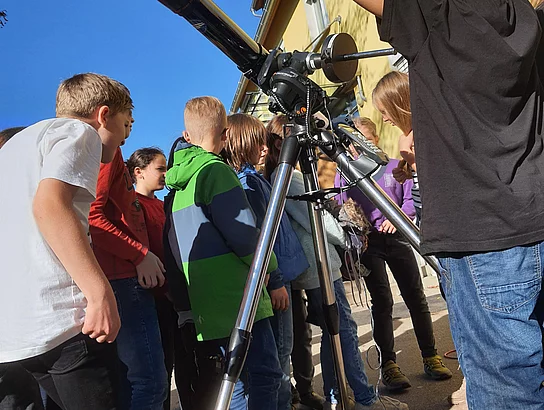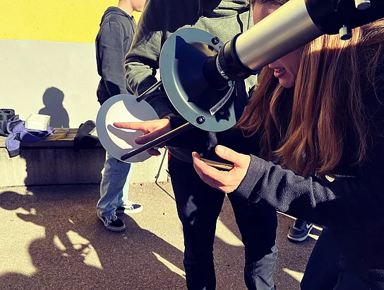Schülerinnen und Schüler des Gymnasiums Wilhelmsdorf beobachten die partielle Sonnenfinsternis.
