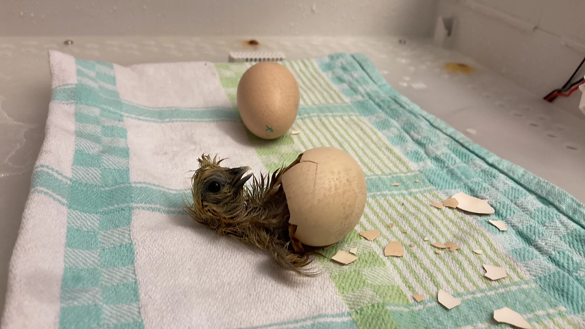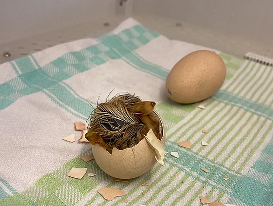 Nach dreiwöchiger Brutzeit hat es "Hugo" geschafft. Das Seidenhuhnküken schlüpft pünktlich zu Ostern und begeistert die Schülerinnen und Schüler der Klasse 5b.