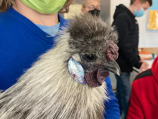 In einem fächerübergreifenden Projekt hatten die Fünftklässler die Entwicklung der Hühnerembyos während des Brutvorgangs begleitet, den Brutautomat im Klassenzimmer versorgt und viel darüber gelernt, was Seidenhühner ausmacht.