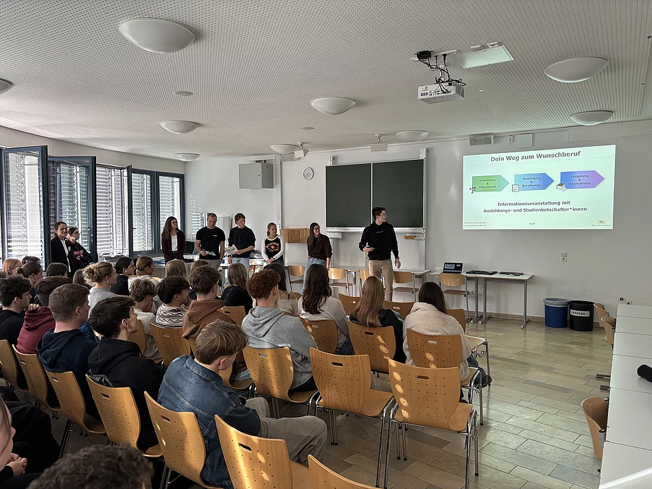 Am Vorbereitungstag für den Studientag 2025 drehte sich für alle Schülerinnen und Schüler der Kursstufe 1 alles um die Fragen: „Was kommt nach dem Abitur?“ und „Welcher Weg passt zu mir?“ Zu Gast waren die Studien- und Ausbildungsbotschafterinnen und -botschafter sowie Vertreterinnen und Vertreter der Duale Hochschule Baden-Württemberg (DHBW) Ravensburg/Friedrichshafen. Nach einer gemeinsamen Begrüßung im Plenum stellten sich die Studien- und Ausbildungsbotschafter mit ihren ganz unterschiedlichen Bildungswegen vor. Besonders eindrücklich blieb dabei die Botschaft von Studienbotschafterin Anna, die betonte: „Man kann auch Umwege gehen.“