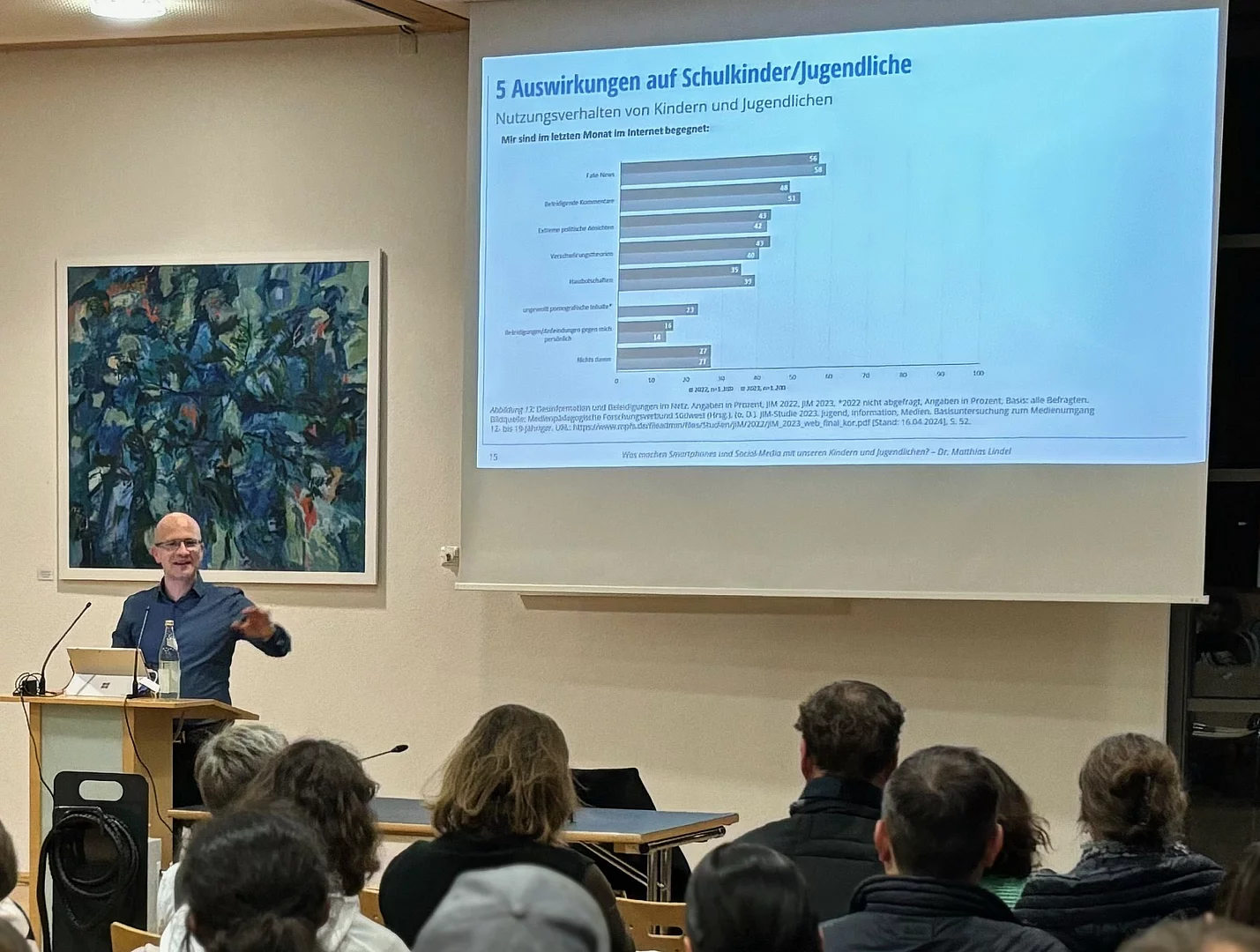Am Ende seines Vortrags richtete Dr. Lindel einen eindringlichen Appell an die Eltern: „Reflektieren Sie Ihr eigenes Nutzungsverhalten! Sie haben eine Vorbildfunktion!“ Es sei entscheidend, mit den Jugendlichen im Gespräch zu bleiben und gemeinsam einen verantwortungsvollen Umgang mit Smartphones zu finden. Ein pauschales Verbot sei keine Lösung. Vielmehr müsse jede Familie ihren eigenen Weg finden, um den schädlichen Auswirkungen entgegenzuwirken und dennoch die Vorteile der modernen Technologie zu nutzen.