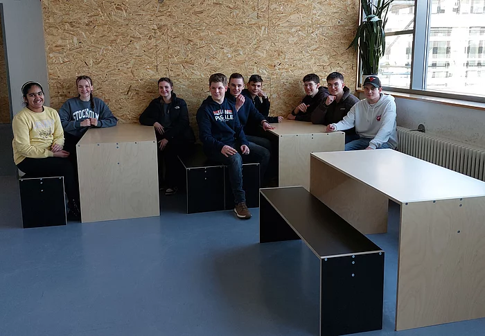 Bei einem Kopperationsprojekt mit der Möbelschmiede Zußdorf erstellen Schülerinnen und Schüler Pausenbänke für den Aufenthaltsbereich im neuen Schulgebäude.