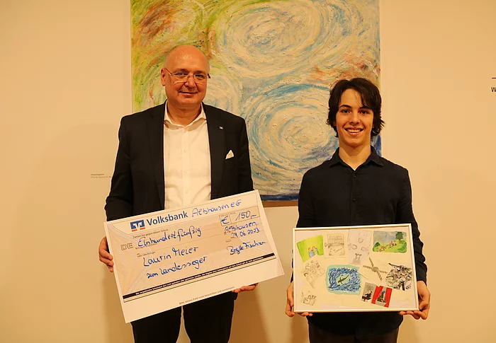 Zum wiederholten Mal wurde der Oberstufenschüler des Gymnasiums Wilhelmsdorf bei dem hochkarätigen Kunstwettbewerb ausgezeichnet. Mit seiner Arbeit zum Thema Zusammenhalt errang er den Landessieg beim Bundesweiten Wettbewerb der Volks- und Raiffeisenbanken. Mit ihm freute sich sein Familie, sowie seine Kunstlehrerin Christiana Zimmermann und seine Tutorin Martina Deters.