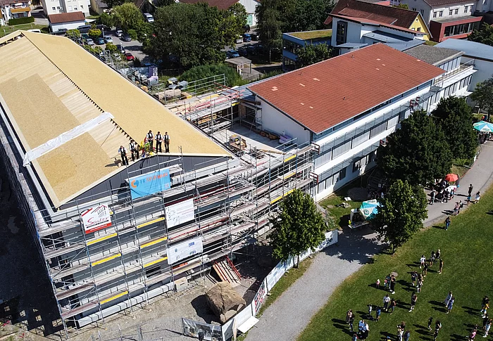 Der Schulneubau feiert Richtfest! Nach dem Spatenstich im Oktober 2021 wurde der Rohbau innerhalb von nur 10 Monaten gefühlt im Zeitraffer fertiggestellt und kann nun für den Innenausbau freigegeben werden.