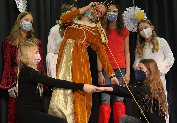 Unter der Leitung von Regine Krause brachten Schülerinnen aus den Klassen 5 und 6 das Musical „Leben im All“ auf die Bühne. Mit ganzer Hingabe, viel Tempo und Charme präsentierten die Akteure ihr Können, das im Rahmen des Freien Kursangebots erworben wurde. Durch "Learning by Doing" bekamen sie einen umfassenden Einblick in mehrere Teildisziplinen des Musicals, wie Gesang/Musik, Tanz, Kostüm und Choreographie.