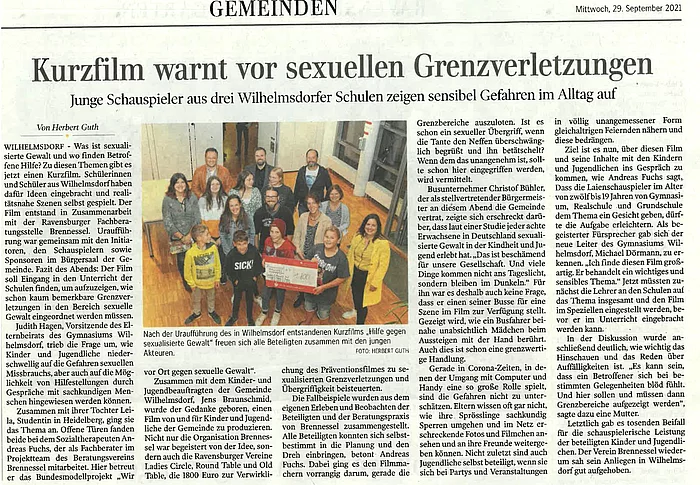 Eine Gruppe von Jugendlichen aus dem Gymnasium Wilhelmsdorf und der Otto-Lilienthal Realschule haben gemeinsam mit Judith und Leila Hagen und der Unterstützung von der "BRennessel" in Ravensburg ein Filmprojekt zu dem Thema "Sexualisierte Gewalt" produziert und das Ergebnis im Bürgersaal der Gemeinde Wilhelmsdorf vorgestellt. Lesen Sie den Artikel hierzu in der Schwäbischen Zeitung.