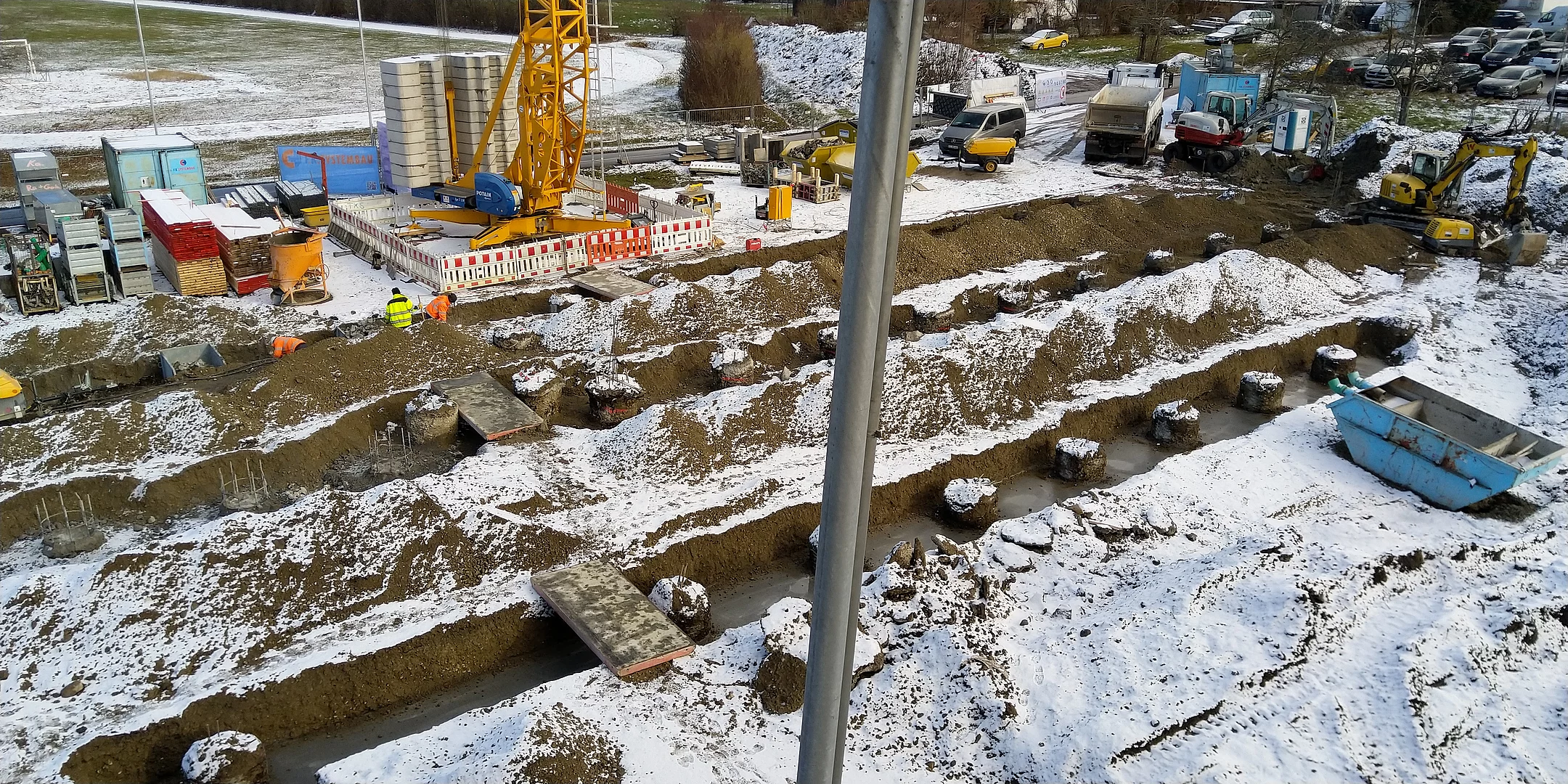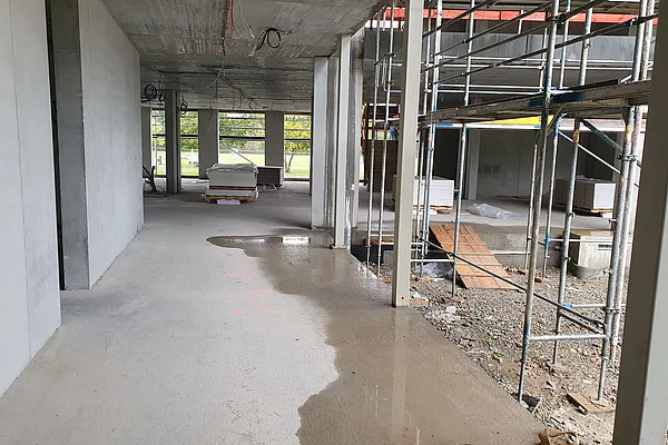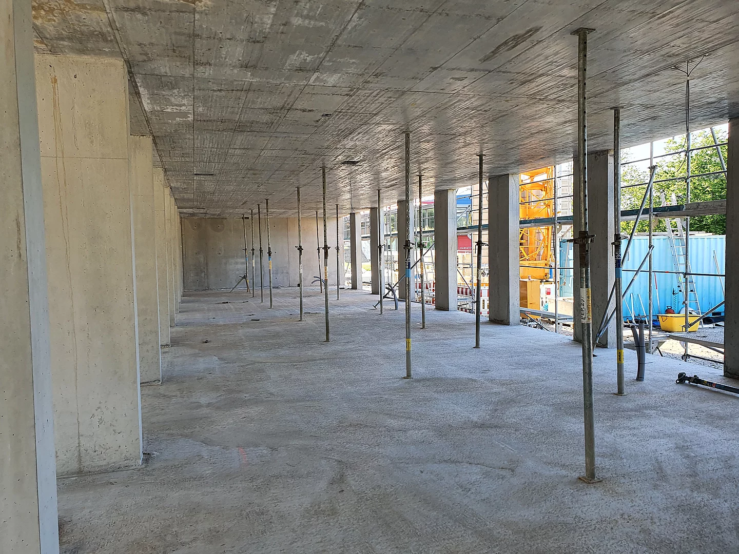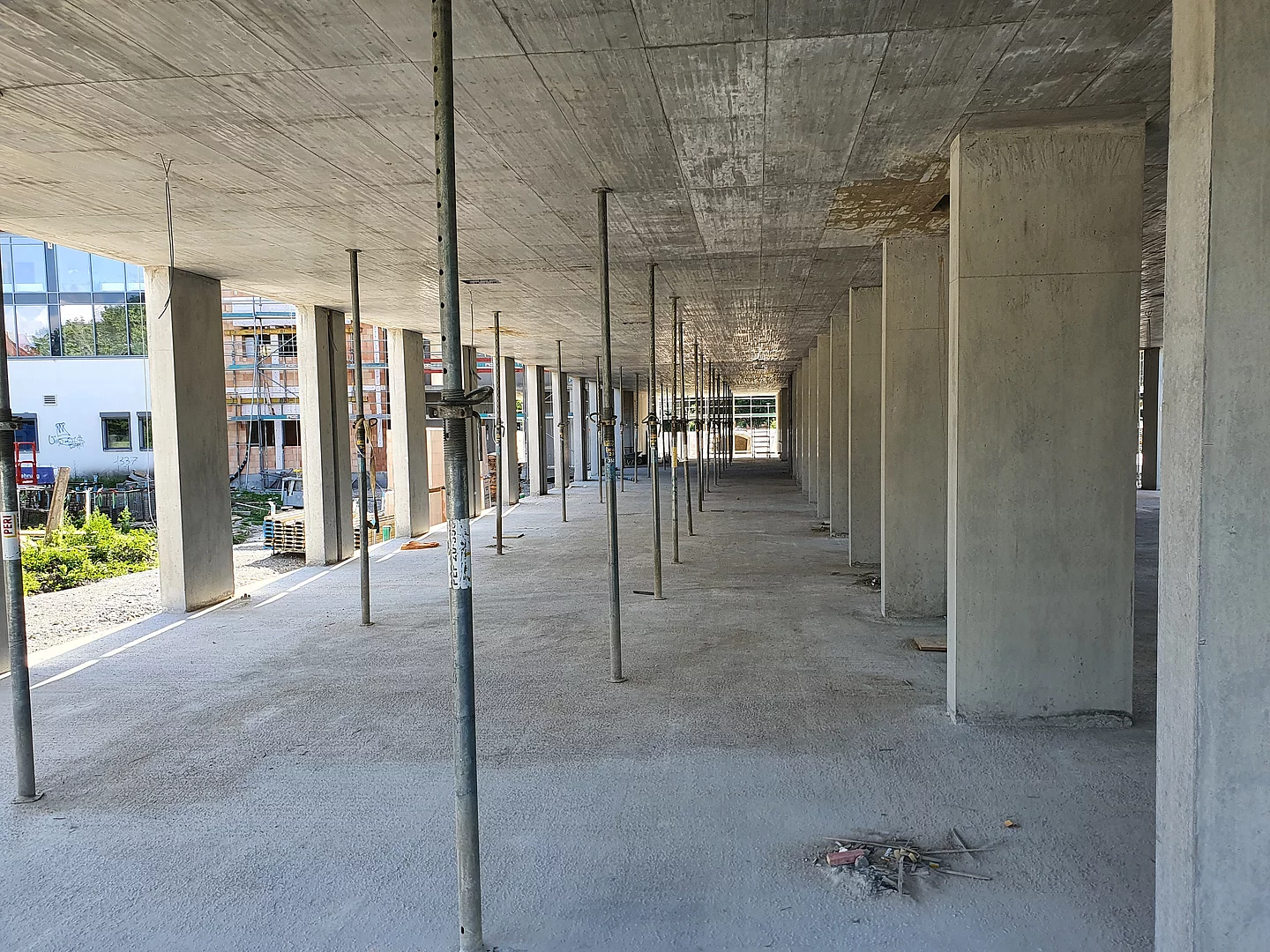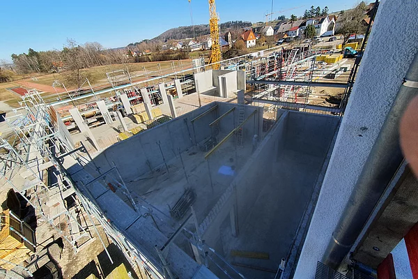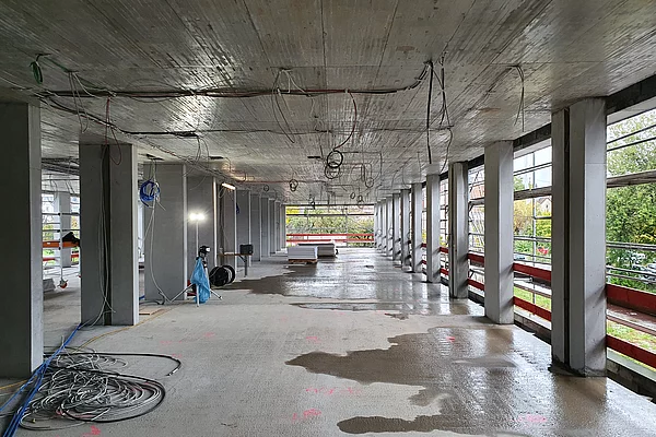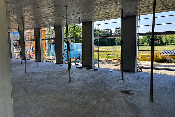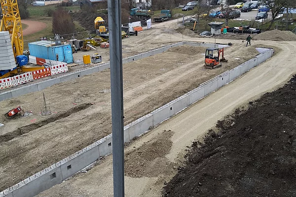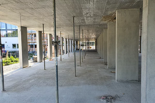Die Baustelle ist in drei Abschnitte aufgeteilt. So können die Bauarbeiten gleichmäßig und ohne Verzögerungen vorangebracht werden. Der erste Abschnitt ist der vordere Bereich, wo bereits die Wände des Erdgeschosses stehen und mit der Verschalung für die Decke begonnen wird. Der zweite Bauabschnitt ist das zweite Drittel, in dem die Wände und Säulen verschalt sind und gegossen werden. Im dritten Bauabschnitt stehen momentan noch keine Wände sondern lediglich die Bodenplatte ist fertig gestellt.