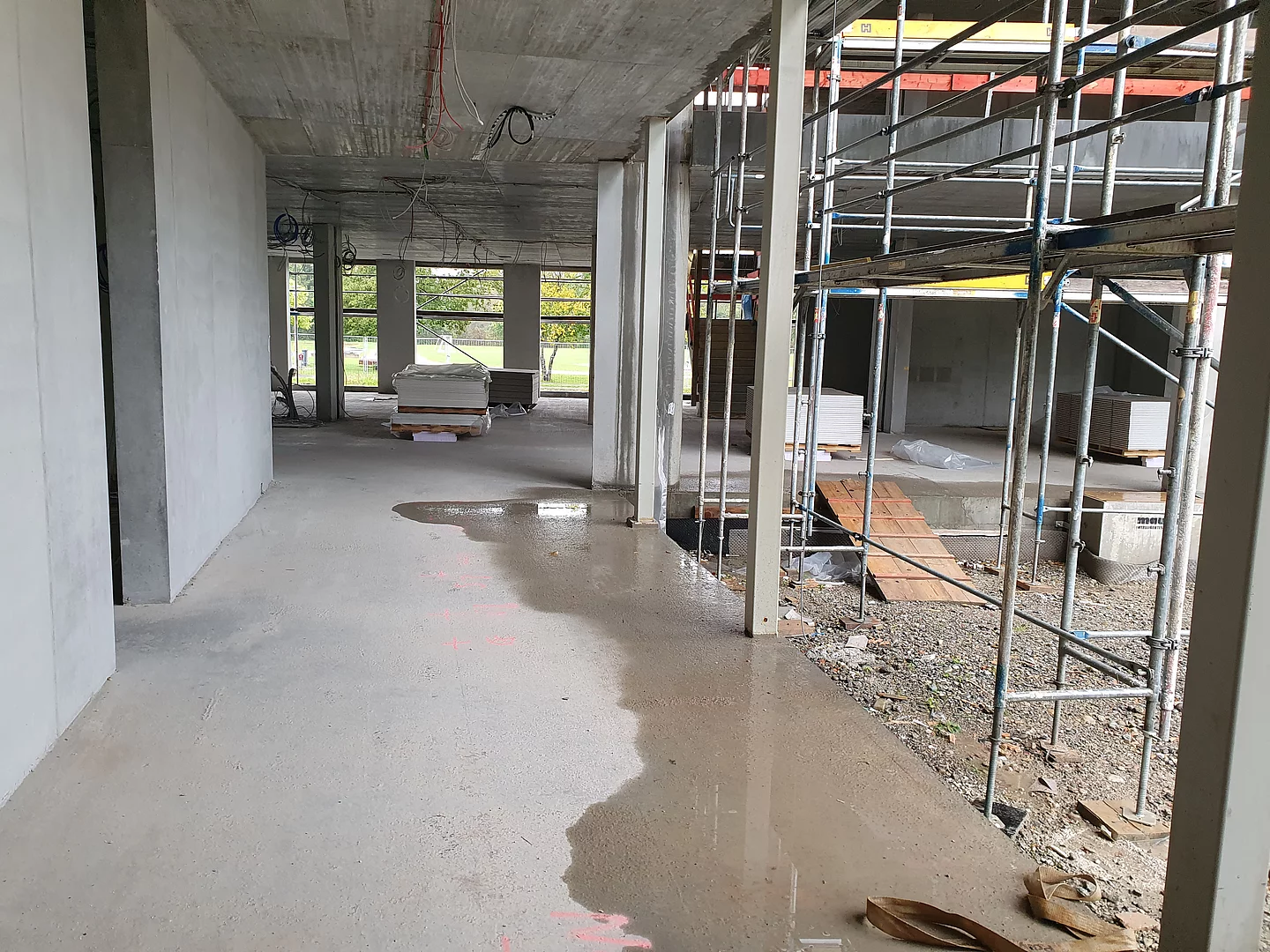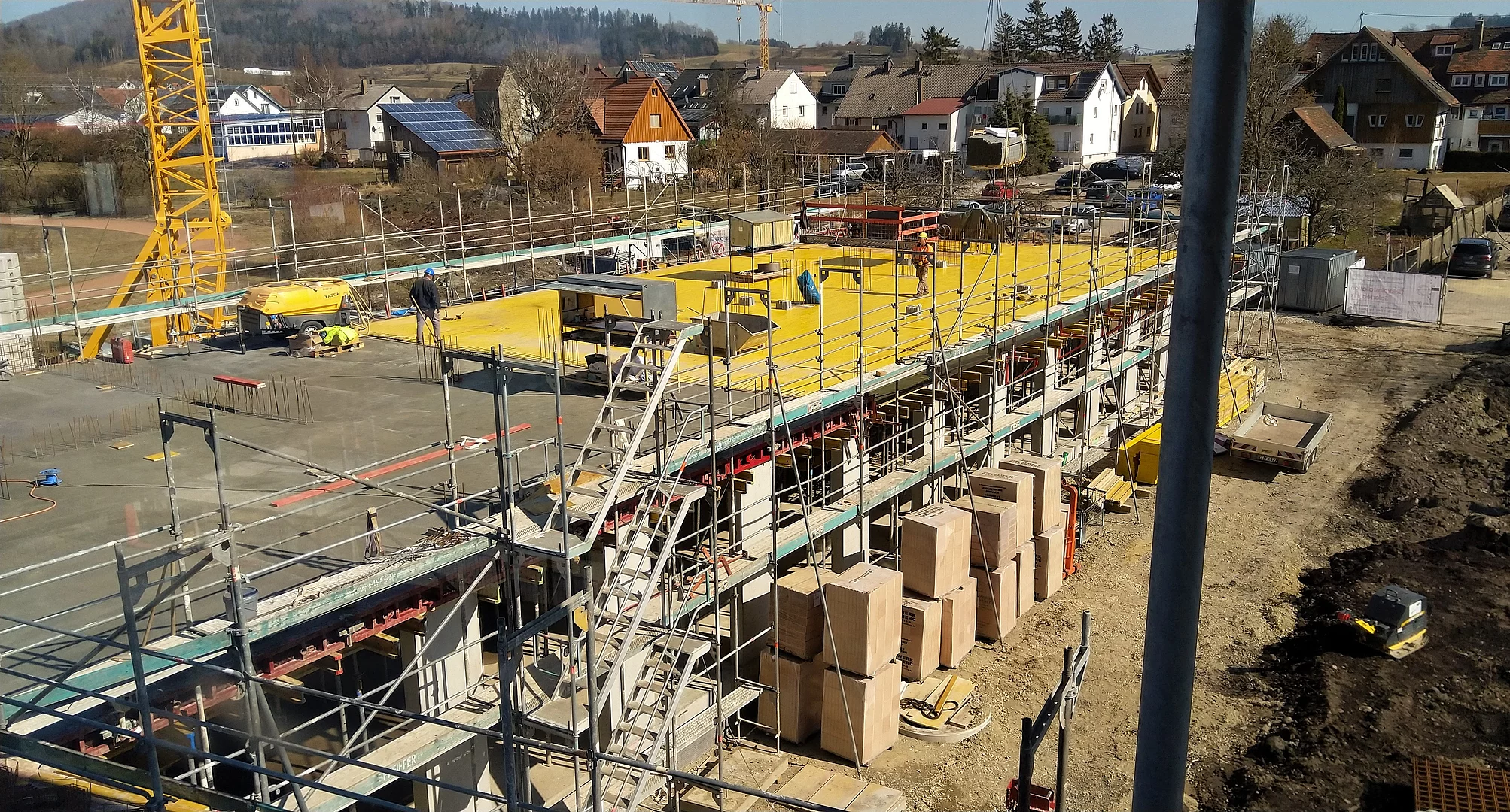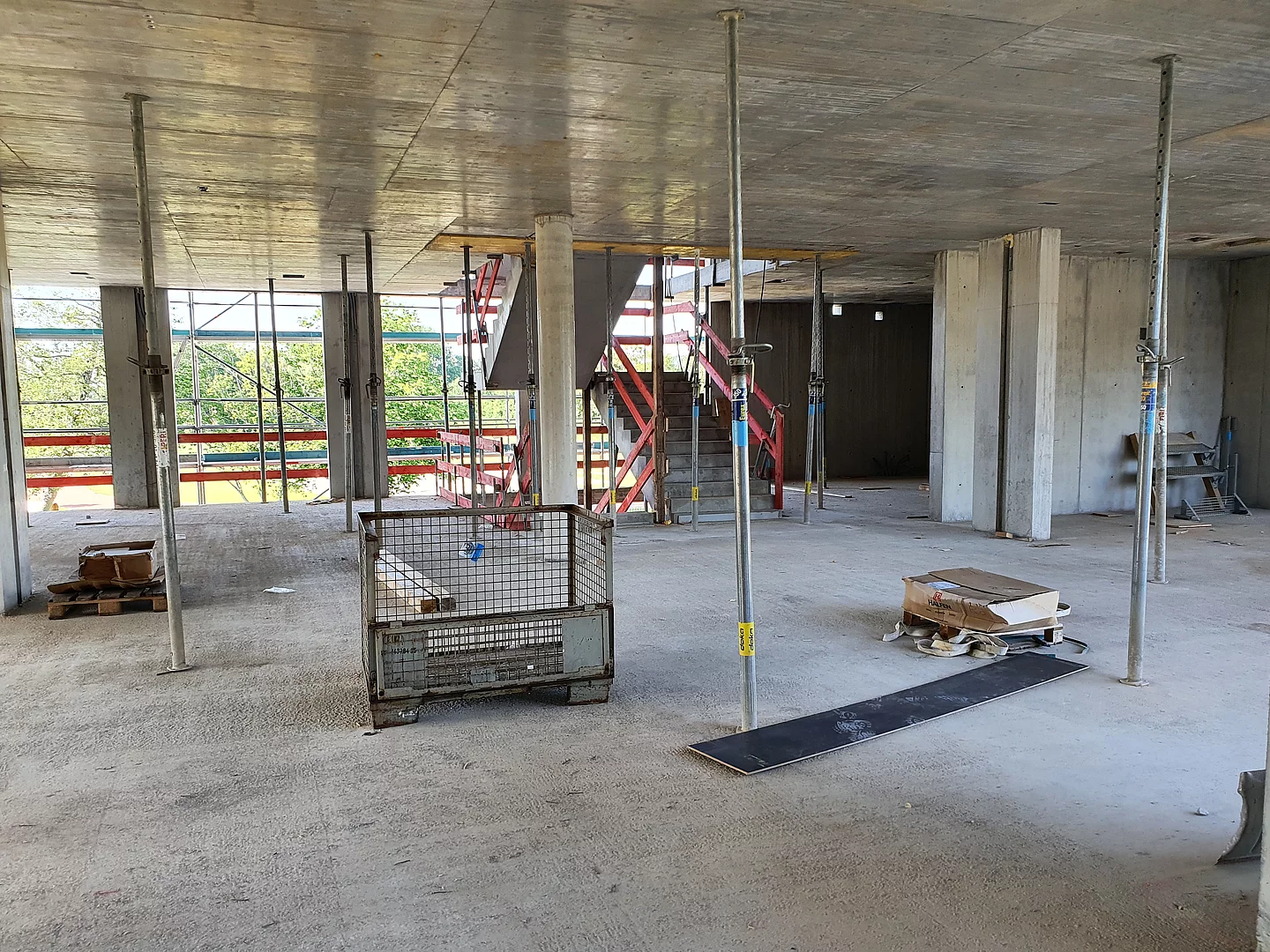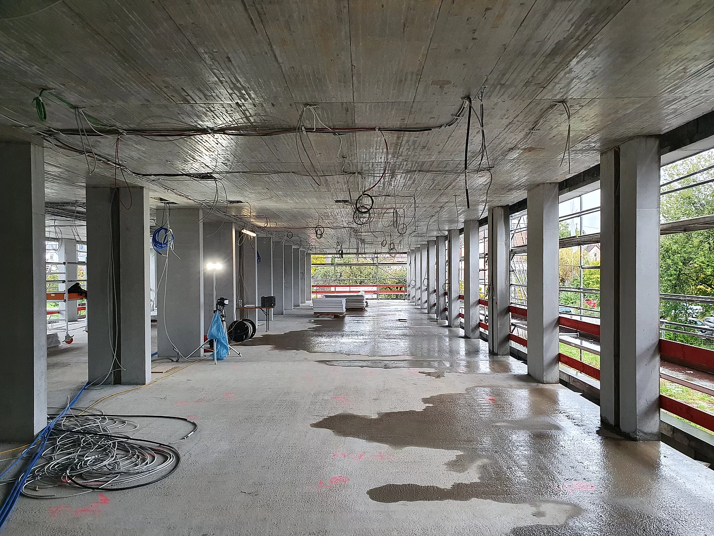 Die Baustelle ist in drei Abschnitte aufgeteilt. So können die Bauarbeiten gleichmäßig und ohne Verzögerungen vorangebracht werden. Der erste Abschnitt ist der vordere Bereich, wo bereits die Wände des Erdgeschosses stehen und mit der Verschalung für die Decke begonnen wird. Der zweite Bauabschnitt ist das zweite Drittel, in dem die Wände und Säulen verschalt sind und gegossen werden. Im dritten Bauabschnitt stehen momentan noch keine Wände sondern lediglich die Bodenplatte ist fertig gestellt.