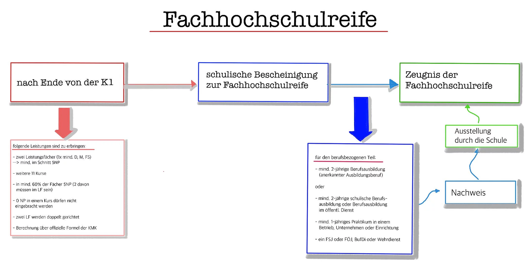 Nach der Kursstufe 1 besteht die Möglichkeit, die Schule mit der Fachhochschulreife zu verlassen. Hierfür müssen jedoch einige Kriterien erfüllt sein (siehe Grafik). Mit dem Verlassen der Schule erhält die Absolventin oder der Absolvent die schulische Qualifikation für die Fachhochschulreife. Nach einer erfolgreichen Ausbildung oder einem Praktikum (siehe Grafik) wird von der Schule das Zeugnis der Fachhochschulreife ausgehändigt.